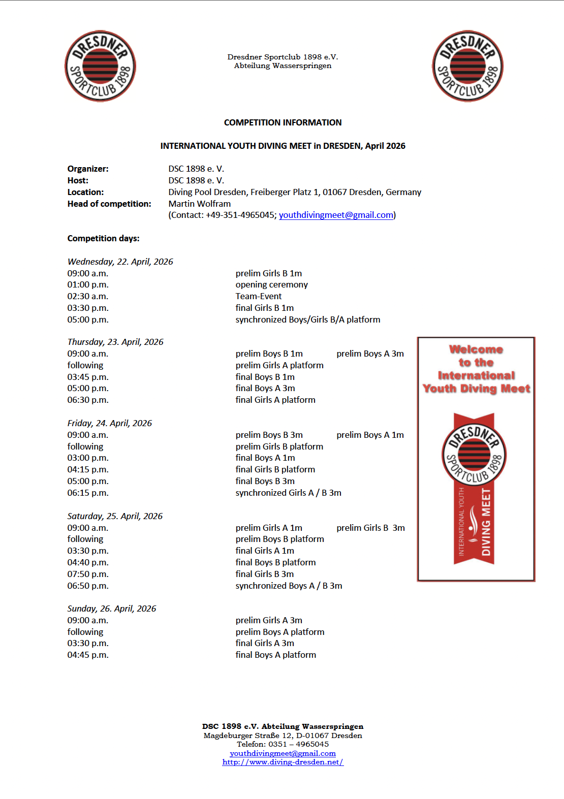 The competition regulations (CR), the legal order and the anti- doping regulations of the German Swimming Association (DSV) apply. The CR are aligned according to the rules of the World Aquatics and binding for all who participate in this DSC 1898 e.V. event.